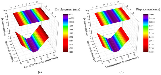 The graphical representation of the vertical displacement averages of three samples of each sequence can be seen in Figure 10. Figure 10, with (a) the multipass sequence with single orientation, M[s], and (b) the multipass sequence with alternated orientation, M[a]. It is also possible to see, in Figure 10, the positioning of the sections A–H and 1–4 of the control grid of the steel sheets.
