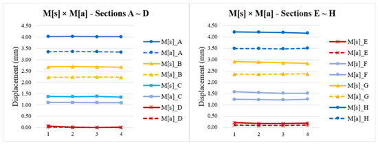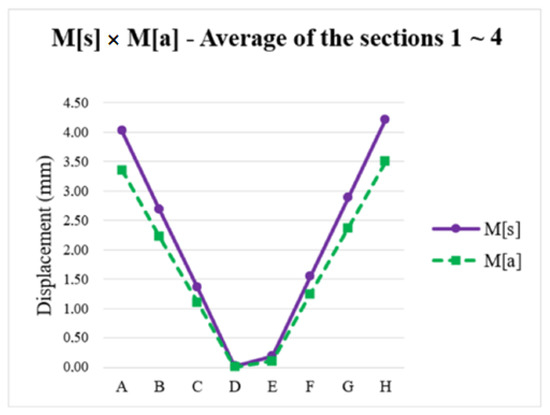 In Figure 11, sections A to H are indicated, and in Figure 12 are the averages of sections 1, 2, 3, and 4, since the standard deviation between the values obtained from the cross sections were less than or equal to 0.03 mm. The comparative graphs of M[s] × M[a] enabled analysis of the deformation patterns and the amplitudes of the displacements caused by the welding process by comparing the sections, with the continuous lines referring to the welding sequence in the single orientation and the dashed line referring to the alternated orientation.