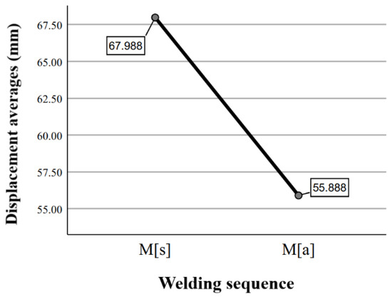 ANOVA was used to obtain the true null hypothesis as a result (p < 0.05) for the welding orientation factor. Therefore, we concluded that the orientation of multipass welding had a significant effect on the final distortion of the samples and that, in general, the specimens of multipass welding with alternated orientation had an average vertical displacement 17.8% lower when compared to the sequence of multipass with single orientation (Table 4). It also verified the decreasing of displacement average of M[a] comparing with M[s], as can be seen in Figure 13.