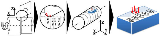 The 3D hybrid method was developed by Mondelin et al. for 15-5PH steel [23]. This numerical approach, developed in SYSWELD, focuses on the imprint of the cutting process, in terms of the thermomechanical solicitations applied to the surface. It does not simulate the chip formation or the material separation around the cutting edge, in order to avoid numerical problems (Figure 1). The key issue in this model relies on the estimation of the equivalent thermomechanical loadings and their application to the surface model, to reproduce the loading sequence during several revolutions. The cylindrical workpiece is simplified to a parallelepiped shape (Figure 2). This assumption only makes sense when large diameters (compared to the chip formation volume) are involved.