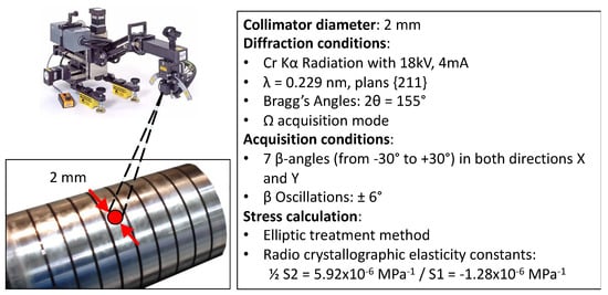 The residual stress gradients were measured using the X-ray diffraction method (PROTO XRD). The diffraction parameters and elasticity constants for 15-5PH are indicated in Figure 4. A detailed description of this measuring technique is available in [3].