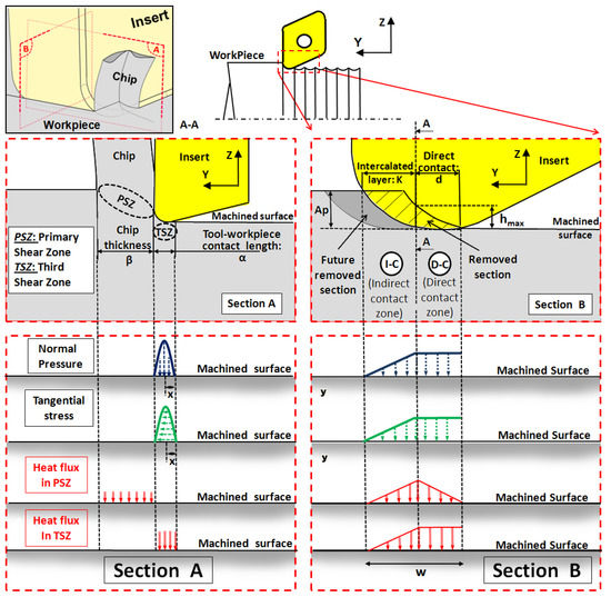 Figure 4 presents the distribution of the thermomechanical loadings. The simplified shapes of the thermomechanical loadings were obtained by several numerical investigations using Abaqus/Explicit, as presented by [23]. The influence of the primary shear zone (PSZ) was modelled by using a heat flux having a triangular distribution over a surface with a length equal to the actual chip thickness β and a width W coming from a geometrical construction (Figure 5). The mechanical load on this area was neglected.