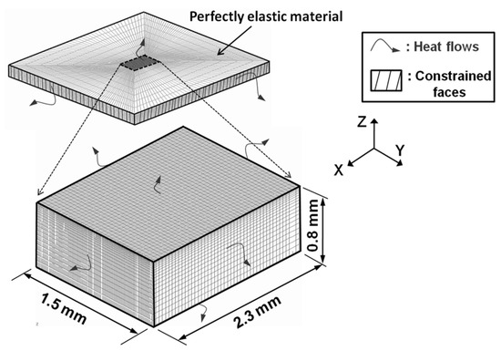 The model considers the part as a parallelepiped (Figure 6) having the following dimensions: 1.5 mm × 2.3 mm × 0.8 mm. The top surface of the parallelepiped corresponds to the machined surface on which the thermomechanical loadings are applied. Its dimensions are wide enough to avoid any influence of the borders in its center where residual stresses are estimated. The dimensions are also wide enough to simulate several turning revolutions. This parallelepiped is divided into two volumes. A small volume in the center having comprehensive thermo-plastic properties. It is embedded in a perfectly elastic and larger parallelepiped, that enables to reduce calculation duration. Five sides of the parallelepiped are in contact with the rest of the workmaterial and heat exchanges are possible.