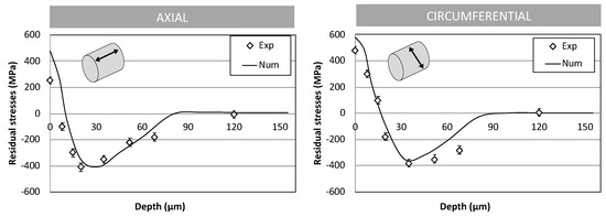 Once again, it should be noted that there is no clear trend in the external residual stress, from an experimental point of view. On the contrary, the numerical model predicts an increase. As discussed previously, the model does not model microstructural modifications (dynamic re-crystallization), which leads to an overestimation of the true residual stress value in the external layer.