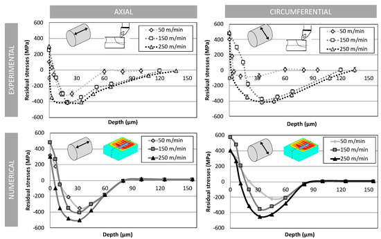 Figure 9 presents the evolution of the axial and circumferential residual stress gradient corresponding to the 2 cutting speeds (Vc = 50 and 250 m/min) around the nominal reference case study at Vc = 150 m/min. It seems that an increase of cutting speed leads to a deeper compressive peak and a larger affected depth. The 3D hybrid model is able to predict the effect on the peak of compression, but it does not reveal the evolution of the affected depth.