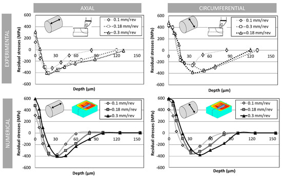 This section deals with the sensitivity to the feed per revolution f, which mainly influences the uncut chip thickness. Three values were selected: 0.1, 0.18 and 0.3 mm/rev. The observations of the experimental residual stress profiles (Figure 10) show a correlation with the affected depth. A larger feed induces a higher affected layer. The magnitude of the peak of compression does not seem to be affected; it only shifts deeper with an increase in the affected depth.