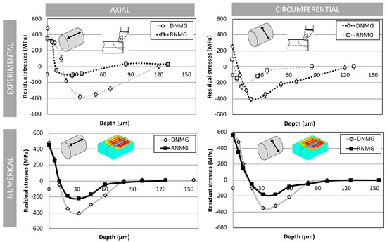 It should be noted that there is no clear trend of external residual stress, neither from an experimental point of view, nor a numerical one.