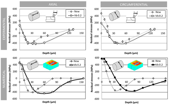 As far as the external residual stress is concerned, tool flank wear leads to a significant decrease in tensile stress in a circumferential direction, for large flank wear. It can be assumed that this is due to a more intense dynamic re-crystallization phenomenon. This cannot be predicted by the model. On the contrary, the axial residual stress state in the external layer is not affected.