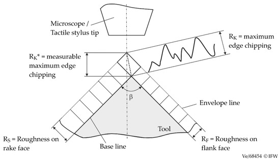 In order to characterize the cutting edge chipping, Heiß [24] defined the cutting edge as the connecting line between the rake face and the flank face assuming ideally sharp tools. For rounded tools, the area where effective rake and clearance angles, γeff and αeff, differ from the nominal angles, γ and α, is considered as the cutting edge [17]. Figure 1 shows the schematic representation of edge sharpness according to Heiß, which is related to an ideally sharp cutting edge [24]. After edge preparation, the original definition of cutting edge chipping according to [24] is no longer applicable, as there is no longer a defined connecting line between the rake face and the flank face, so that line-based parameters can only be used to a limited extent to describe the topography of the cutting edge. Therefore, in the following, cutting edge chipping is understood as a term for the initial deviation between the real and ideal cutting edge microtopography after tool manufacturing. This means there are no micro-breakouts on the cutting edges of the tools after a short period of use.