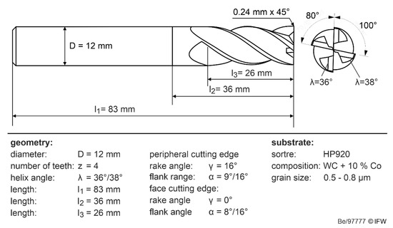 In the first step, the influence of the process parameters during grinding of end mills was investigated. For this purpose, round-ground cemented carbide blanks of the company Mapal Dr. Kress KG of the type HP920, with a cobalt content of 9% and a diameter of D = 12 mm, were used. A 5-axis HELITRONIC VISION 400 L tool grinding machine from Walter was used for the grinding tests. The resulting tool geometry after grinding is shown in Figure 3 below.