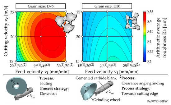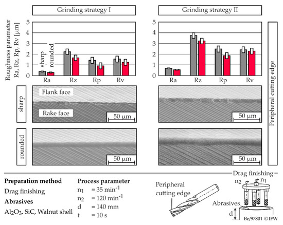 One of the main factors influencing the quality of the cutting edge is the grain size of the abrasive. An increase in grain size from D30 to D76 leads to a significant increase in the average roughness value by 25%. In addition, it can be seen that the average roughness Ra increases slightly with increasing feed rate. This can be attributed to the thermomechanical load. The values of the roughness parameters increase with increasing mechanical load, characterized by the average single grain uncut chip thickness hcu. The single grain uncut chip thickness can be assumed to be proportional to the ratio of the feed rate to the cutting speed. This can be observed up to a critical value. From this value on, the size of the average single grain chip thickness favors a brittle material removal. As a result, the values of the roughness parameters decrease. Furthermore, if the cutting speed is reduced and the feed rate is increased, a reduction in the thermal load and, consequently, a lower thermal softening of the cemented carbide can be expected. The reduction in the local thermal stress seems to compensate the effect of the increasing single grain uncut chip thickness. In contrast, the decrease in roughness parameters at high cutting speeds is due to the higher ductility of the cemented carbide as a result of thermal softening. The process strategy with regard to the kinematics of the grinding wheels also has a significant influence on the roughness parameters considered (Figure 5). In this context, the orientation of the cutting vector during grinding of the circumferential flank face shows a significant influence on the cutting edge quality. Thus, a trajectory of the abrasive grain in the direction of the cutting edges favors the cutting edge quality [23]. The material near the cutting edge undergoes a supporting effect, and is subjected to compressive stresses that counteract crack initiation. In contrast, a reversed trajectory, starting from the flank face in the direction of the cutting edge, causes a reduction in surface quality. The tensile stresses induced during grain exit promote the formation of stress cracks, which can be attributed to the low tensile strength of cemented carbide. The influence of flank face grinding outweighs the influence of flute grinding. Thus, only a slight increase in edge roughness was observed when changing from down-cut grinding to up-cut grinding. In the following, the combination of climb grinding during groove machining and a trajectory in the direction of the edge during circumferential machining will be referred to as strategy 1, and the reverse case as strategy 2.