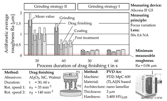 Finally, the influence of the coating process and the coating post-treatment were investigated. For this purpose, a commercially available nanolaminar (Ti,Al)N coating was synthesized using the PVD-Arc process. The coating post-treatment was again performed by drag finishing. The process parameters for coating and post-treatment were kept constant. In the following, the interactions within the whole process chain are discussed. It has already been shown that a different initial roughness due to grinding cannot be equalized with the selected process parameters, and that differences in the roughness parameters continue to exist after edge preparation. This effect was also observed when the process duration of drag finishing was increased from t = 10 s to t = 30 s and t = 60 s (Figure 7) with subsequent coating and coating post-treatment. In addition, the initial cutting edge roughness has a significant effect on the cutting edge rounding. The resulting cutting edge rounding was 25 ± 3 µm for strategy 2 (high roughness) and 18 ± 3 µm for strategy 1 (low roughness). In contrast, the process duration during drag finishing showed only a minor influence on the size of the cutting edge rounding.