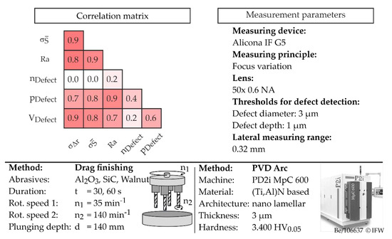 In order to derive a suitable parameter for cutting edge chipping, the measured values of the cutting investigations were evaluated using statistical methods. In the first step, Pearson correlation coefficients were calculated between the roughness/defect parameters and the wear volume. The Pearson coefficient r is a measure of the linear correlation between measured values Xi und Yi in the range −1 ≤ r ≤ 1 (Equation (1)). For r = 0 there is no correlation, and for r = 1 there is a perfect correlation between the considered values.