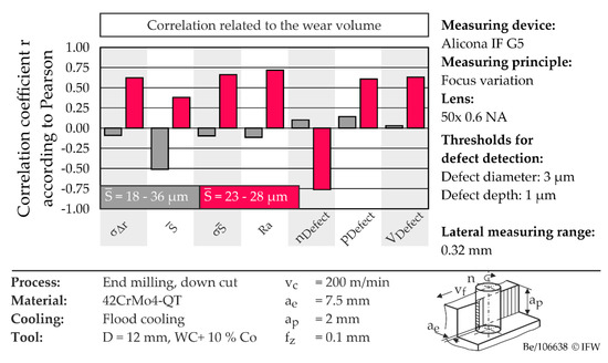 Figure 12 gives an overview of the calculated Pearson coefficients between the different edge quality characteristics and the mean wear volume, depending on the considered parameter range of the cutting edge rounding.