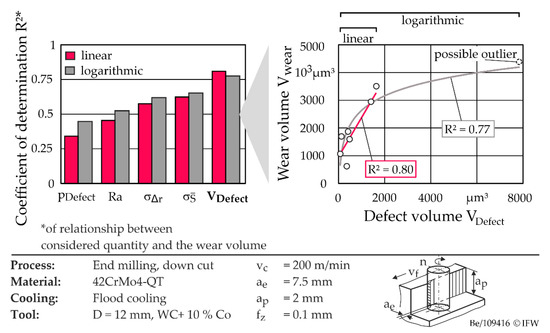 In order to determine a suitable parameter for cutting edge chipping, functional relationships between the wear volume and the considered parameters were derived for tools with cutting edge roundings of = 23–28 µm. The coefficient of determination R² was used to evaluate the goodness of fit. This is a dimensionless measure that expresses the proportion of variability in the measured values of the dependent variable (here wear volume) that is predictable from the independent variables. In all cases (except for the number of defects), the relationship between the cutting edge chipping parameters and the wear volume can be approximated by means of a logarithmic function. This is exemplified in Figure 13 (right) for the defect volume. Assuming a logarithmic relationship, the highest quality of fit with R2 = 0.77 was determined for the defect volume, shown in Figure 13 (left). Excluding the possible outlier marked in Figure 13 (right), the data sets show a rather linear behavior. The coefficients of determination obtained in this case show similar values and tendencies to those assumed for a logarithmic relationship. The defect volume is therefore recommended for the characterization of the cutting edge chipping. However, in order to predict tool wear, the size and shape of the cutting edge rounding must be taken into account, in addition to the cutting edge chipping.