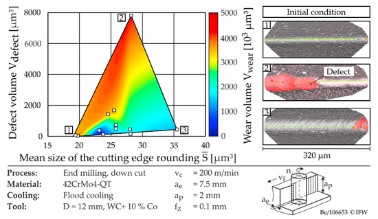 The defect volume was used to characterize the chipping. The extent of the defects along the cutting edge is shown for selected tools at the corner points of the parameter range considered in Figure 14 (right). The defects are marked in red. In Figure 14 (left), the influence of the cutting edge rounding and the defect volume on the wear volume is shown as a color-coded response surface. The latter was created using cubic interpolation with interpolation points based on the cutting tests. Here, it can be seen that the tool wear increases significantly when the cutting edge rounding is reduced below = 20 µm, or when the defect volume is increased. During the cutting tests, the highest wear resistance was found for a tool with minimum defect volume and cutting edge rounding with = 24 µm. With further increase in the cutting edge rounding, a slight increase in the cutting edge wear was observed, which can be attributed to the increasing ploughing effects.