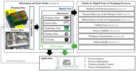 A basic digital twin structure was presented based on an existing information model. The digital twin results from cascading of specific process model output determining machine and path inaccuracies, material removal and tool engagement, cutting force, process stability, thermal behavior, workpiece and surface properties. The digital shadow created by task definition as well as data acquisition from planning and processing provides the input data for these models. The model output is superimposed to a digital twin that corresponds to the real component that unites the real and virtual world. The model output, individually or superposed, is visualized in an easily comprehensible manner. This process-related consideration is further extended in favor of an integral software architecture approach, based on forward-oriented planning from operational practice. As a result, the introduced information model and the process models are expanded to include task definition and data collection, data platform and data handling as well as model integration. Finally, visualization, analysis and feedback are discussed and an outlook is given.