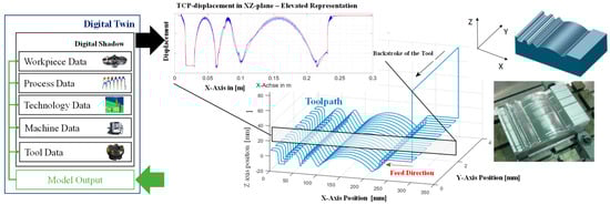 The specific tool information (e.g., diameter, number of teeth, cutting edge angle, etc.) serves as input information for the cutting force calculation or the location-specific process stability determination [33]. The resulting virtual workpiece, based on the output of the material removal simulation, considers the actual position of the TCP (Figure 2), the tool displacement induced by the machining forces (Figure 4) as well as wear (constant between measurements). The result, however, is a spatially discrete mapping of a share of the total path deviation. The total path deviation, in turn, can be approached by the integration of further models (e.g., surface location error) until complete correspondence with the real component, which on the digital side adds up to the complete digital twin.