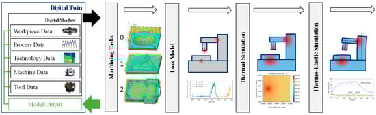 The complete procedure, applicable as a standalone solution or model cascade application (Figure 1), includes loss estimation, thermal simulation and thermo-elastic deformation as illustrated in Figure 3. The integral digital twin provides a suitable framework to forecast thermo-elastic deformations since representative process data are provided by flanking models, which improves the quality of the thermal simulations.