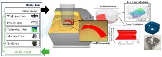 Another determination method for the effective cutting forces and feed forces are based on the current commands of the feed or spindle drive motors [44]. A corresponding model captures losses, induced by the structural dynamic chain and/or distortions between the effective point and the motor, in order to calculate the tangential part of the acting cutting force using the torque-forming current obtained in the process [45]. This calculation is performed with a machine-specific calibrated leakage current model [45] to achieve the leakage current for the complete speed range of the spindle. This procedure, which is also described in detail by Hänel et al. [46], is characterized by its simple applicability, low parameterization effort and high accuracy which ensures high practical applicability. In addition, this approach can be transferred to determine radial and axial force components using the feed axes data of the machine tool [4]. Nevertheless, modeling and calibration are significantly more complex for these cutting force components and associated with considerable efforts. Additionally, the calculation of these cutting force components is based on the time and location discrete values of the feed direction angle with respect to the machine reference system, or the current effective components of the feed axes, respectively. As a result, there is a non-linear increase in complexity when performing these calculations for the 5-axis milling process instead of using, e.g., 3-axis. The advantage of this method goes beyond the calculation of effective cutting forces. In fact, the main advantage lies in the ability to integrate these results in the digital shadow while using the in situ process data for the determination of the specific cutting force coefficients (e.g., Altintas, Kienzle) which is described in detail by Arnold et al. [47]. In this way, the input parameter for the below described empirical force calculation is adapted or extended by corresponding process data, which improves the accuracy of the cutting force coefficients. Hence, it should be emphasized that the digital shadow is not a static element—the opposite—the digital shadow continuously evolving, being enriched with calculated process information (cf. Section 2). Furthermore, the linkage of models (e.g., material removal, cutting force, leakage current, etc.) illustrates the systematic approach towards an integral digital twin of the machining process being assest by comparison with the component (Figure 5).