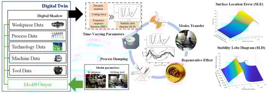 Chatter is the most important destructive factor in machining, being induced by the self-excited vibration in the machining system [48]. In fact, regenerative chatter is the most common phenomenon during cutting processing, caused by the non-coincidence of the vibrational displacement between the currently engaged and previously engaged tool tooth. The possibility of avoiding chatter mainly depends on the result of the stability lobe diagram (SLD) being achieved by solving the dynamic equations [36]. The construction of the SLD requires the frequency response function of the machining system composed of the tool and workpiece dynamics, i.e., establishing the SLD along the machining tool path. A digital twin of the machine tool enables the user to align virtual and physical machining scenarios, which could bring significant advantages for stability prediction. This shall be emphasized in Figure 6, where the modal parameters of the tool and workpiece are introduced as part of data acquisition while contributing the digital twin for machining processes. Moreover, the modal parameters are updated after every process model integration loop (Figure 5).
