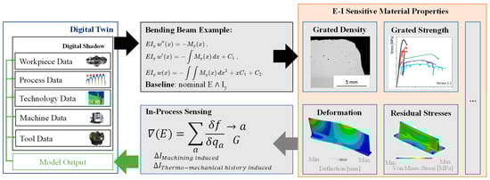 Illustration of the baseline with nominal material properties using the example of Young’s modulus and the second moment of inertia with the further discretization of property graduation induced by spatial deviation of material properties including feedback by the means of in-process sensing and/or a material digital twin.