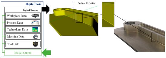 Furthermore, there are statistical and data-driven models [19] that mathematically link to a measured value and a location-specific event (e.g., chatter marks) are suitable too. The latter models can be supplied with data from databases while causalities can be made visible via, e.g., random or fixed correlations. In fact, data-driven models are well suited to determine individual features (e.g., surface defects) linking them to a cause (e.g., tool wear) via experience-based knowledge as part of the digital twin. Either way, the result of this methodical approach in terms of accuracy and resolution strongly depends on the quality of the applied data. If integrating several models, as required to achieve a digital twin of machining processes (cf. Section 2), requires functional interfaces [16] in order to depict interactions realistically. Cutting force and regenerative chatter-induced path deviations, for example, are such accumulated errors that can result in a target-actual-deviation if compared to the component specification in terms of planning data.