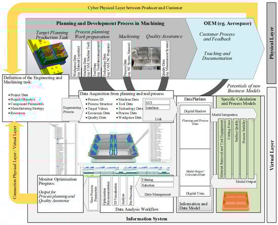 Sztipanovits et al. [81] state in this regard that the heterogeneity of tasks, data and information is an enormous challenge for a successful implementation. Jedrzejewski et al. [82] confirm this conclusion and also present a linkage approach for machining technology applications with a strong focus on a digital representation of the machine and its control. This work, on the other hand, goes beyond that by taking into account the tool (Figure 2) as well as the component (Figure 3, Figure 4 and Figure 5) and the material (Figure 7). Hence, the physical layer of a classic forward-oriented planning process is extensively expanded by a virtual layer, that reflects the models presented at the beginning, in order to firstly illustrate these relationships (Figure 9).