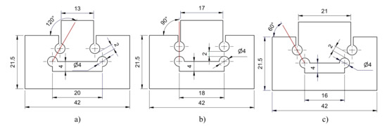 Multiaxial double-notched specimens for distinct pressure angle configurations: (a) 120; (b) 90; (c) 60 (units: mm).