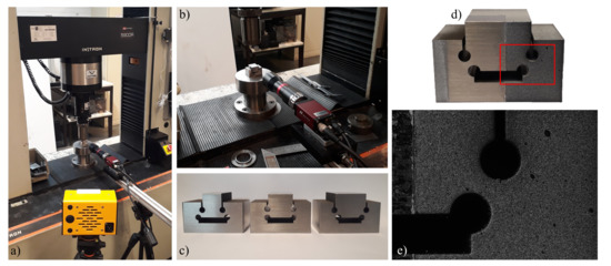 (a) The experimental apparatus of the multiaxial double-notched tests; (b) a detailed perspective of the DIC setup; (c) a sample of each tested specimen geometry; (d) speckle application on half-specimen; (e) DIC image of the signalled notch region.