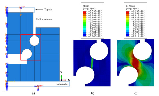 (a) Multiaxial specimen numerical model scheme with applied boundary conditions; (b) equivalent plastic strain; (c) von Mises stress fields of the red-signalled region for a top die displacement of 0.22 mm.