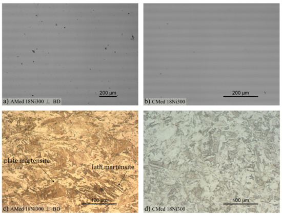 Metallographic samples of (a) AMed and (b) CMed 8Ni300 before etching; chemically etched metallographic samples of (c) AMed and (d) CMed 18Ni300.