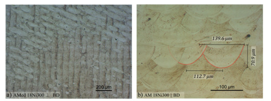 Electrolytically etched samples of AMed 18Ni300 in (a) perpendicular- and (b) parallel-to-build directions (BD).
