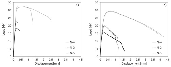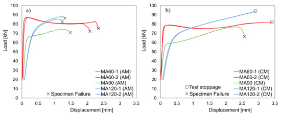 Load vs. displacement curves resultant from the multiaxial double-notched tests of (a) AMed and (b) CMed maraging steels (note: the initial experimental response was removed from the representation due to non-linear contact effects).