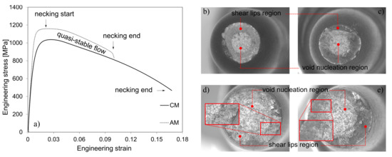 (a) The engineering stress–strain curve showing quasi-stable flow occurrence (diffuse necking). Fracture surfaces of the tensile test from smooth cylindrical specimens: (b) cup and (c) cone fracture geometries of CMed maraging steel; (d) cup and (e) cone fracture geometries of AMed maraging steel.