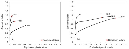 The numerical simulation of the quasi-static tensile tests enables the prediction of pressure dependent fracture strain and, thus, the identification of damage onset behaviour for the high stress triaxiality range (≥0.33). As depicted in Figure 8, the maraging steel shows sensitivity to that parameter, regardless of its metallurgical condition. The analytical stress triaxiality proposed by Bridgman [36] relies on the assumption of rigid perfect plastic flow. Despite being convenient for specimen notch design, that assumption should be corrected by taking into consideration a more realistic constitutive behaviour, resulting in a more accurate representation of the stress triaxiality at the onset of damage. Figure 10 shows the simulated stress triaxiality evolution in function of plastic deformation for both metallurgical conditions of the maraging steel. Despite the accurate analytical prediction for very small strains, significant evolution of stress triaxiality is noticed which is due to incipient geometrical softening (necking) of the specimen. The procedure for fracture strain estimation consisted in matching the load–displacement numerical curves fracture location with experimental load–displacement curves.