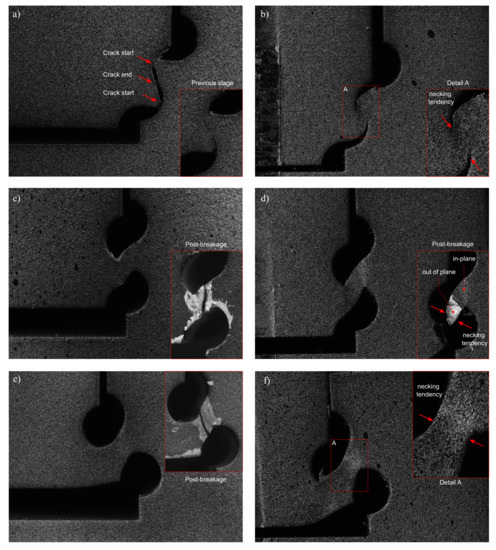 Figure 12d shows an interesting feature that may jeopardise the validity of the DIC analysis in the conventional material. Fracture seems to occur in different locations depending on in-plane dimension, which may evidence material flow in normal to surface direction. As regards to the AMed specimens, it is observed that, in low stress triaxiality, fracture tends to occur in a more controlled manner, which may be related to the highly negative stress triaxialities that hinder fracture occurrence. This effect is noticed by the visible crack propagation in the specimens with 60 pressure angle (refer to Figure 12a) in contrast with the abrupt failure of specimens with 90 and 120 pressure angles (Figure 12c,e).