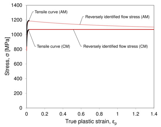 The suitability of the multiaxial double-notched specimens towards the definition of plasticity and damage models was pointed out by Abushawashi et al. [24], in the region of low and intermediate stress triaxiality levels, which are not covered by classical tensile notched specimens. Similar to the study in which the specimens were developed, in the current approach, the flow stress was also identified through reverse methodology. Figure 13 presents the used flow stresses for each metallurgical condition. These curves capture the tensile materials’ response for low strain values and assume either a negative hardening (AMed) or a perfect plasticity (CMed). Due to allowing for an initial hardening and its saturation (or even softening), the combined Swift–Voce model (refer to Equation (2)) was used to build the mentioned curves (the resulting constants are presented in Table 3).