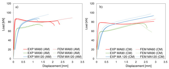 Load–displacement results obtained from the simulation of the multiaxial double-notched specimens for both (a) AMed and (b) CMed metallurgical conditions.