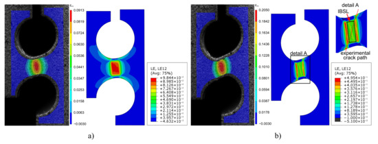 The materials’ high strength, ductility and tendency towards geometric softening (out of plane movement) hindered data retrieval from DIC. Figure 15 shows the shear strain fields comparison (between DIC and FEM) of the AMed multiaxial specimen with a pressure angle of 90. In Figure 15a, which reflects an incipient stage of the test (d = 0.2 mm), one can observe a satisfactory correlation not only in the shear strain values but also its localisation in the centre of the specimens’ ligament. For a more advanced stage (d = 0.5 mm), a highly heterogeneous shear strain field is developed in the numerical model, as seen in the FEM model of Figure 15b. Maximum shear strain seems to localise in two vertical shear bands. Moreover, the specific location where strain is maximum at the contour of the holes seems to realistically portray the crack path, as shown by the red dashed line in Detail A of Figure 15b (refer also to Figure 12c). Despite the inability of DIC to capture the highly heterogeneous strain field, the results show that the DIC predicted values in the centre region of the ligament are somewhat consistent with the average FEM values of the region in between the strain localisation lines (average = 0.278), signalled as IBSL in the solid black rectangle line of the detail of Figure 15b. It is also important to highlight that the experimental deformed shapes of the specimens (obtained by DIC) were coherent with the ones obtained by FEM (refer to Figure 16), allowing for further validation of the built numerical models and determined constitutive flow rule.