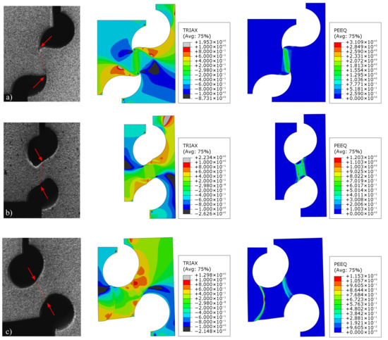 Deformed shape comparison of DIC and FEM results and plotted stress triaxiality and equivalent plastic strain of multiaxial double-notched specimens with pressure angles: (a) 60; (b) 90; (c) 120.