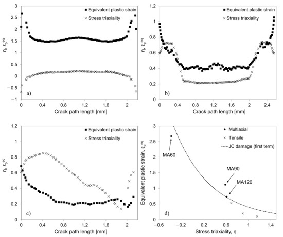 Stress triaxiality and equivalent plastic strain evolution along crack path for multiaxial specimens with pressure angles: (a) 60; (b) 90; (c) 120. The identified damage law (d) using both multiaxial and tensile specimens.