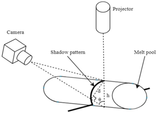 Shape-from-shadow is an active triangulation technique for 3D geometry measurement based on a laser triangulation principle that differs from conventional methods by projecting a shadow pattern instead of light. In addition, pulsed laser is employed—synchronized with camera exposure—which eliminates the influence of the radiation stemming from the process. The set-up is show in Figure 2.