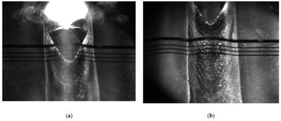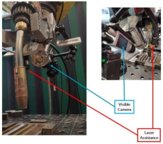 Regarding the configuration for the wetting angle measurement, the same procedure as in the case of laser metal deposition use case was followed. The same camera was attached to the welding torch in the WAAM station with a given angle (45°), pointing out the location where the melt pool forms. Camera and laser illumination formed an angle of 17° (See Figure 4). Two different configurations as shown in Figure 5 were tested; on one hand, in the former, the shadows were projected onto the molten pool so that the wetting angle of the liquid was obtained. In the latter, the shadows were positioned just after the molten metal was solidified. It has to be emphasized that in this case, measurements resulted in higher stability because these were not disturbed by the brightness of the arc. In fact, this was the configuration chosen for the measurements based on the stability criterion.