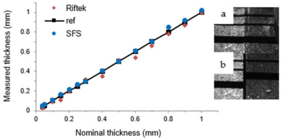 For that purpose, feeler gauges of 0.04–1 mm (Figure 6b) nominal thickness were clamped to a custom made support and measured sequentially with SFS and the laser scanner. Thickness data were collected and visualized on a graph with a reference line. The deviation from the ideal line for both measurement techniques are shown in Figure 6a.