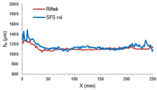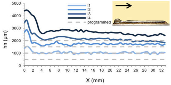 The height measurement of the LMD deposit was performed in-process by SFS mounted on the Z axis support post next to the focusing head to follow the fabrication direction. After fabrication, corresponding LMD thin walls and single layer tracks were measured off-line by the laser scanner repeating the fabrication trajectory, but with an offset of 80 mm in the X direction to reach the deposit with a probe laser of the laser scanner. The single layer single track height measurements are depicted in Figure 7.