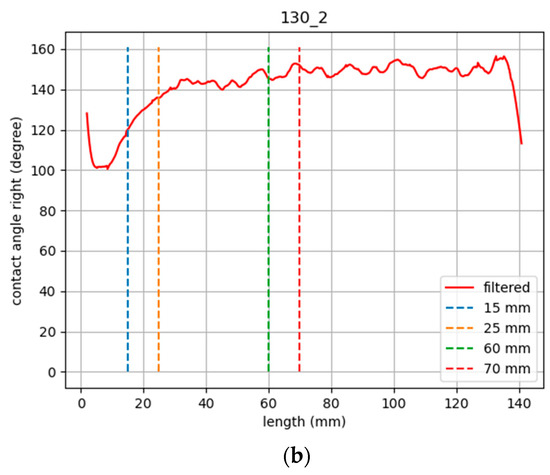 From the above introduced sequences, weld bead geometric parameters were computed following the measuring principle described in Section 2.1. This was based on tracking the projected shadows (via image processing) and calculating the displacement of the line with respect to the reference value (initial straight line). This difference in pixels was translated into millimeters according to Equation (1) (Section 2.1) and considered the parameters (k and θ) that needed to be calibrated beforehand. Finally, to obtain the geometric parameters from the extracted curves, height was computed as the maximum value of the curve while for width and contact angle, additional processing was required. Derivative of the curve had to be assessed in order to automatically determine where the edge of the weld bead was located. As there were two abrupt changes in the derivative curve corresponding to both sides of the weld, the distance between them was defined as the weld width. In addition, at this exact location, the tangent of the curve was calculated as a measure of the contact angle in each of the sides of the weld. As a result, graphs showing the evolution of the different geometrical parameters along the whole weld were obtained. Some of them are illustrated next. As an example, in the following graphs, the contact angle and height evolution are depicted for the high energy input sample. It has to be highlighted that the effect of the bump or accumulated material at the beginning is clearly reflected in the graphs (from 0 mm to 30 mm indicated by the red line) and values stabilized from moment one. Four transversal dashed lines were also included in the graph to indicate the location where weld cross-sections were analyzed for validation purposes.