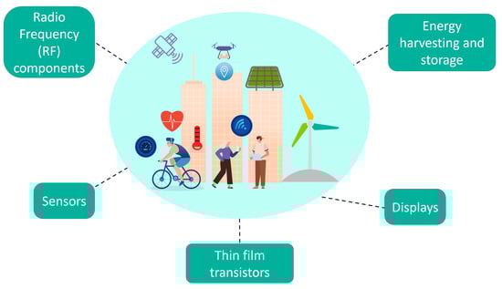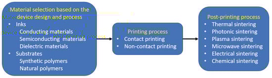 Although the requirements for the mass production of printed electronics with the desired specifications are challenging, the current state-of-the-art for the materials, fabrication processes and inspection technologies demonstrate an increasing trend in both repeatability and functional performance []. Undoubtedly, continuous growth of biodegradable and recyclable material portfolios for conductive, semiconductor and dielectric inks, and synthetic and natural polymeric substrates are fostered by the printing and post-treatment technologies, and optical inspection systems [,]. As a result, printing methods have gained a ground for large area fabrication of flexible electronics including radio frequency identification (RFID) devices; photovoltaic cells; organic light-emitting diodes (OLEDs); thin film transistors (TFTs); diodes; displays; batteries; and sensors measuring temperature, humidity and pH levels [,,,]. These developments demonstrate that reliable and repeatable solutions for the mass production of printed electronics with well-defined manufacturing standards will be available in very near future. In this study, we present the printing principles and approaches by surveying the recent investigations in the manufacturing and material technologies, applications and environmental impacts.