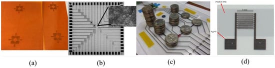 Printed sensors: (a) temperature sensors showing transparent property PEDOT:PSS (Reprinted with permission from []. Copyright 2020 IEEE); (b) a CNT gas sensor array; (c) a resistive pressure sensor array with test weights (Reprinted with permission from []. Copyright 2017 IEEE); (d) a PEDOT:PSS based temperature sensor with silver nanoparticle electrodes (Reprinted from [] under CC BY 4.0 license).