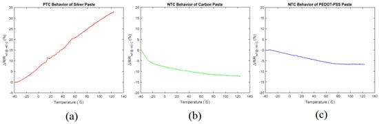 (a) Highly linear PTC behavior of silver throughout the test temperature range; (b) NTC behavior of carbon; (c) NTC behavior of PEDOT:PSS. Note that carbon exhibits near linear NTC behavior after an initial region of non-linear behavior (roughly from −40 °C to −20 °C). On the other hand, PEDOT:PSS behaves near linearly initially from around −40 °C to 70 °C. (Reprinted with permission from []. Copyright 2020 IEEE).